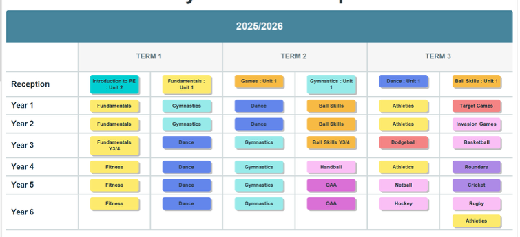 Our curriculum improves the wellbeing and fitness of all children not only through the sporting skills taught, but through the underpinning values and disciplines PE promotes. We enable children to understand the physical world around them. Furthermore, we encourage children to understand the scope of physical activity available and that physical activity can be for everyone and children to understand the benefits of physical activity on the body and mind. Within our lessons, children are taught personal development and fundamental skills needed to be successful and the importance of taking ownership and responsibility of their own health and fitness. Our impact is therefore to motivate children to utilise these underpinning skills in an independent and effective way in order to live happy and healthy lives through a love of sport.