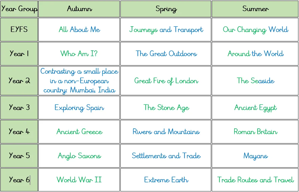 The Environment – EYFS: Keeping our beaches clean; Year 1: different coloured bins, Year 2: recycling, Year 3: being environmentally friendly, Year 4: green energy; Year 5: Fair Trade; deforestation; plastics; Year 6: climate change and its impact.